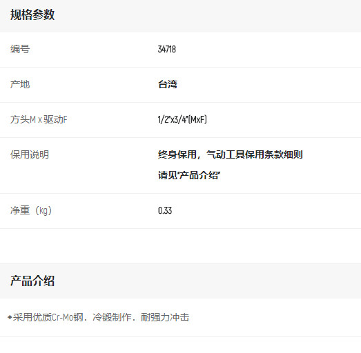 首頁>產(chǎn)品中心>扳手、手用套筒>套筒配件>世達風(fēng)動轉(zhuǎn)接頭1/2"*3/4"
