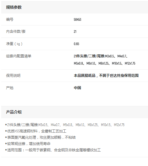產(chǎn)品名字:世達(dá)21件套高速鋼粗牙絲錐組套