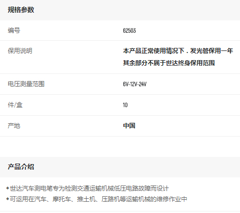 首頁>產(chǎn)品中心>電工電子工具>測電筆>世達(dá)汽車測電筆6V-12V-24V